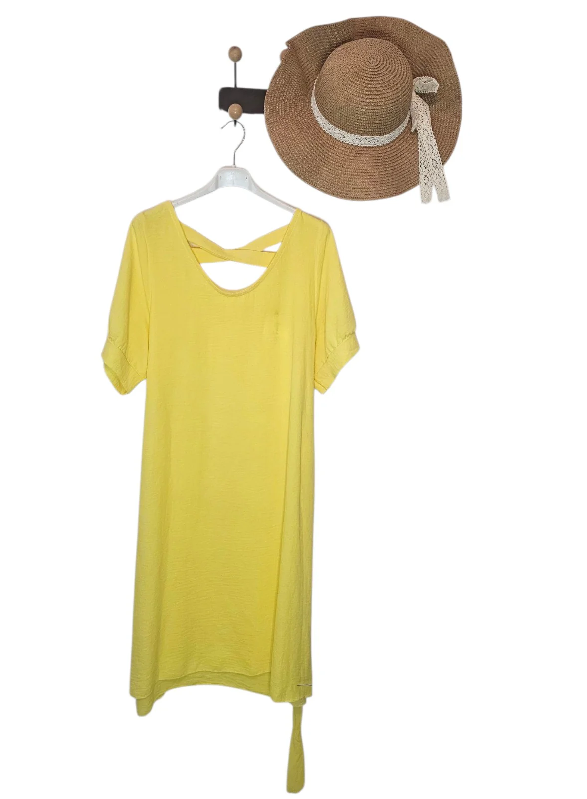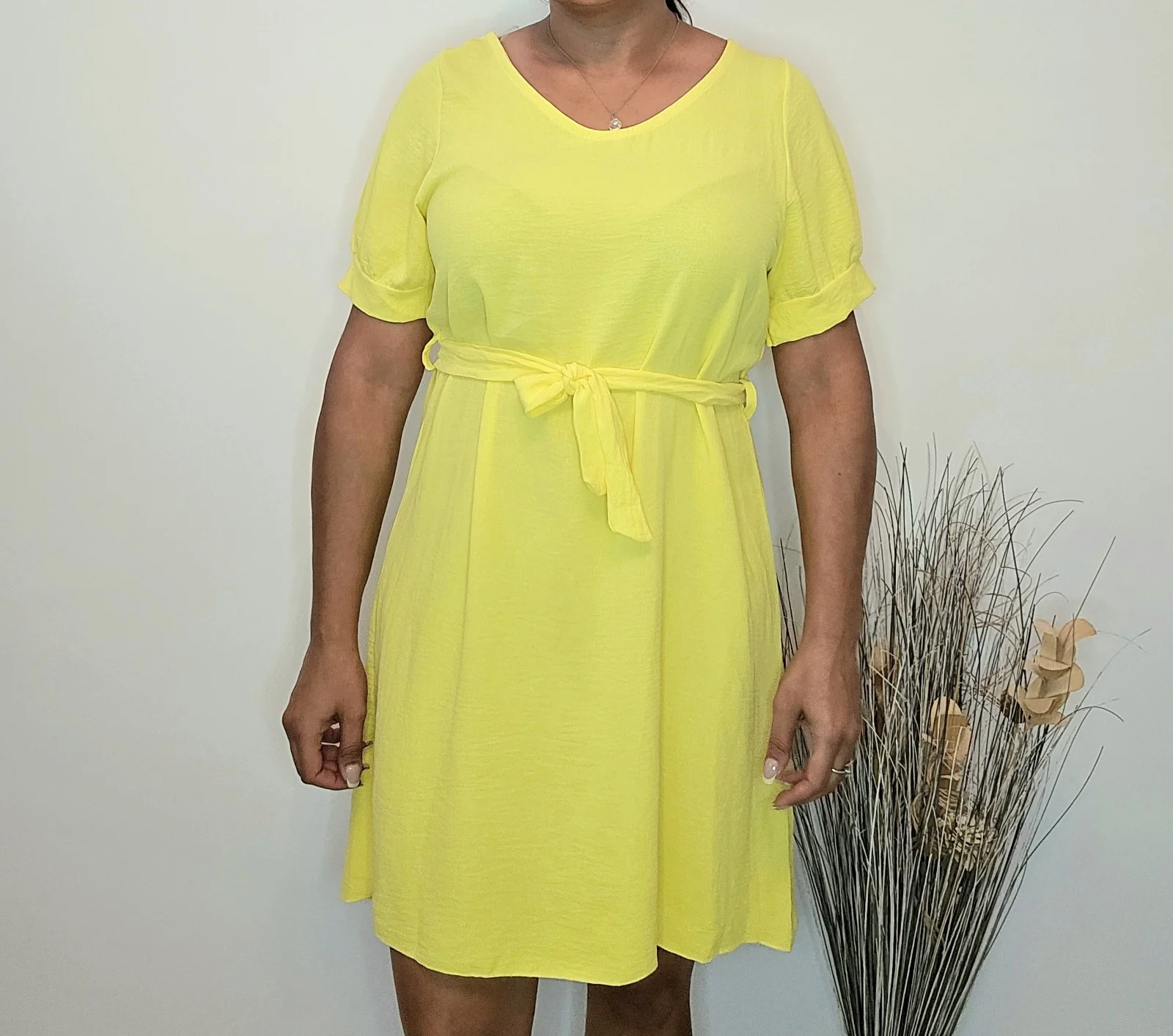 Adoptez un look estival et raffiné avec cette robe jaune fluide à ceinture. Son dos croisé ajoute une touche tendance, tandis que sa coupe légère vous assure un confort parfait tout au long de la journée.