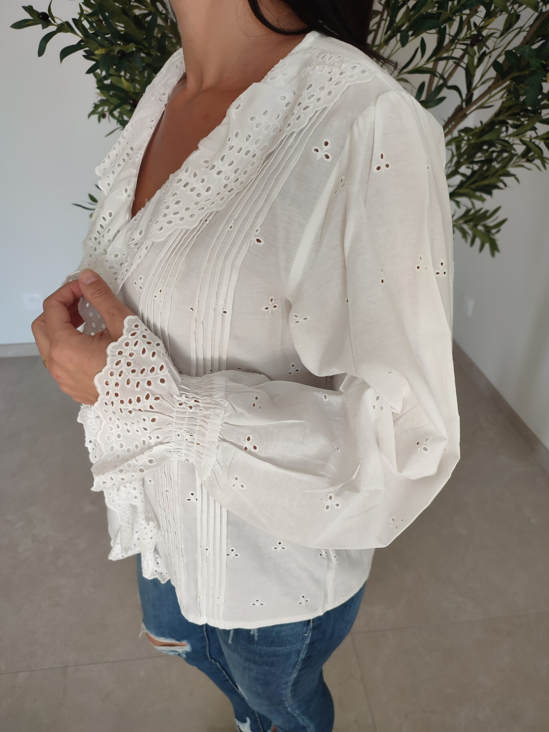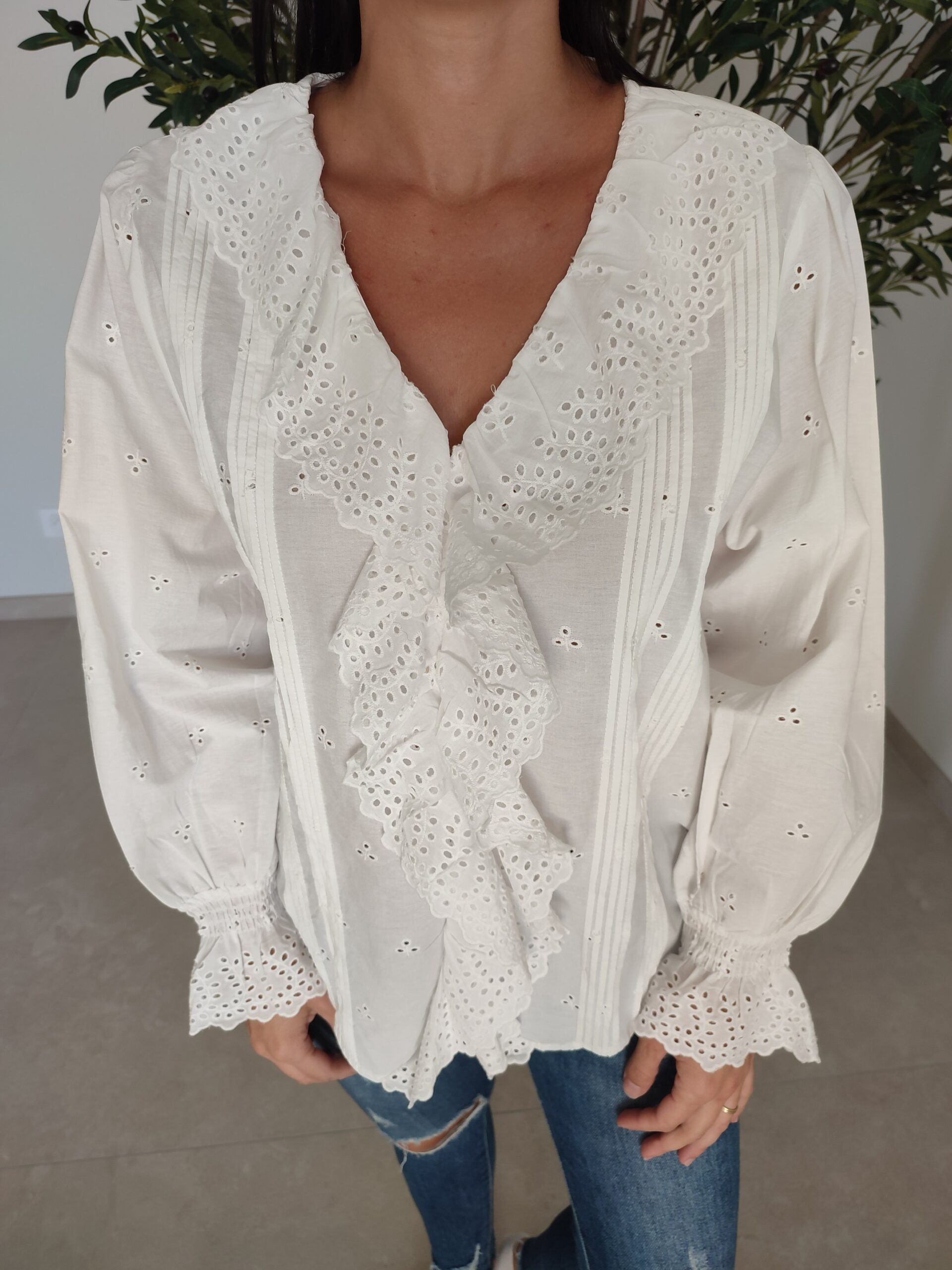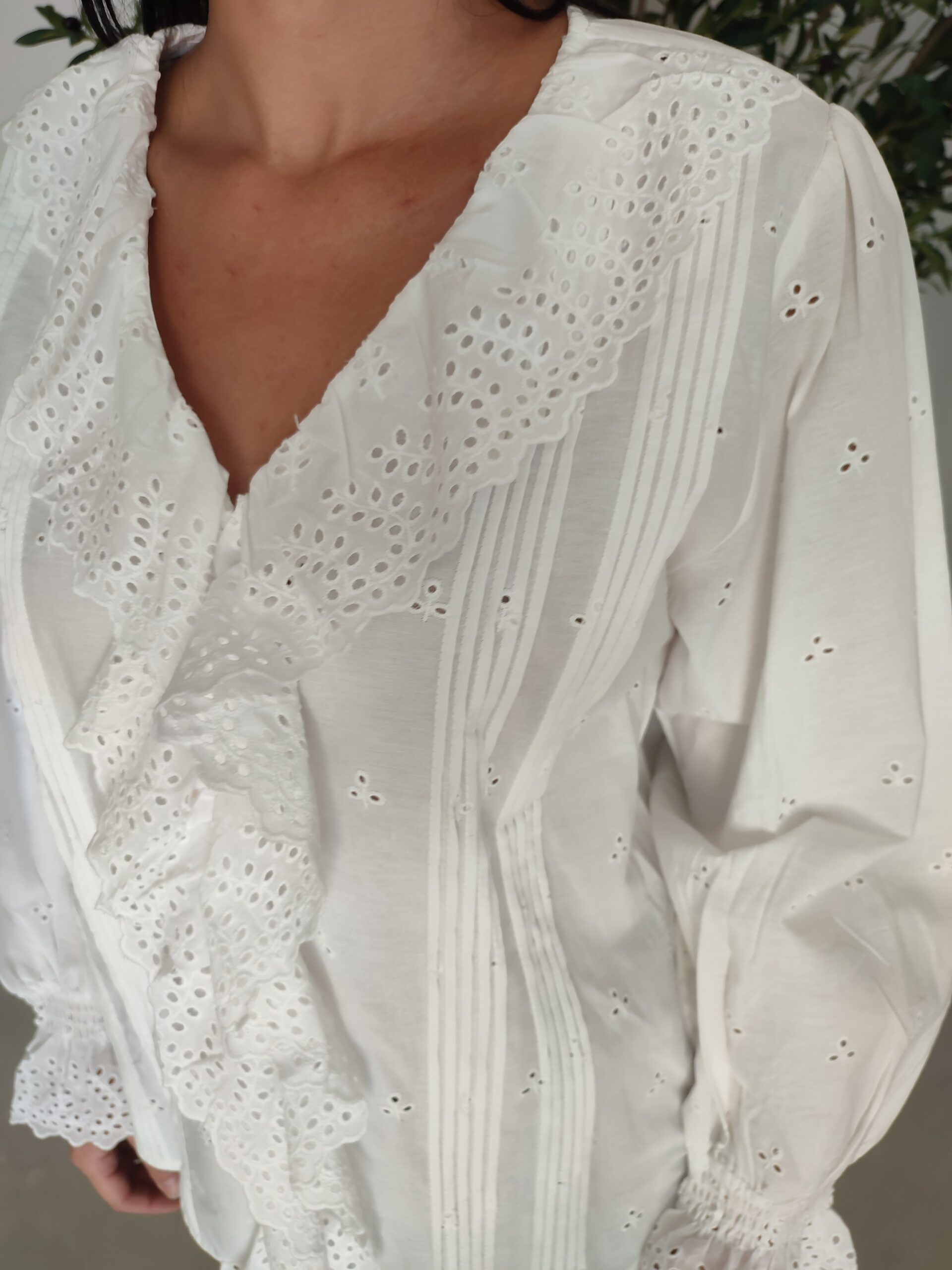 Blouse de la marque ONADO. Col en V. Effet broderie. Volants sur l’encolure et aux poignets. Coupe droite. Le modèle mesure 1m63 et porte la taille S. Composition et entretien : 100% Coton. Consulter l’étiquette avant lavage.