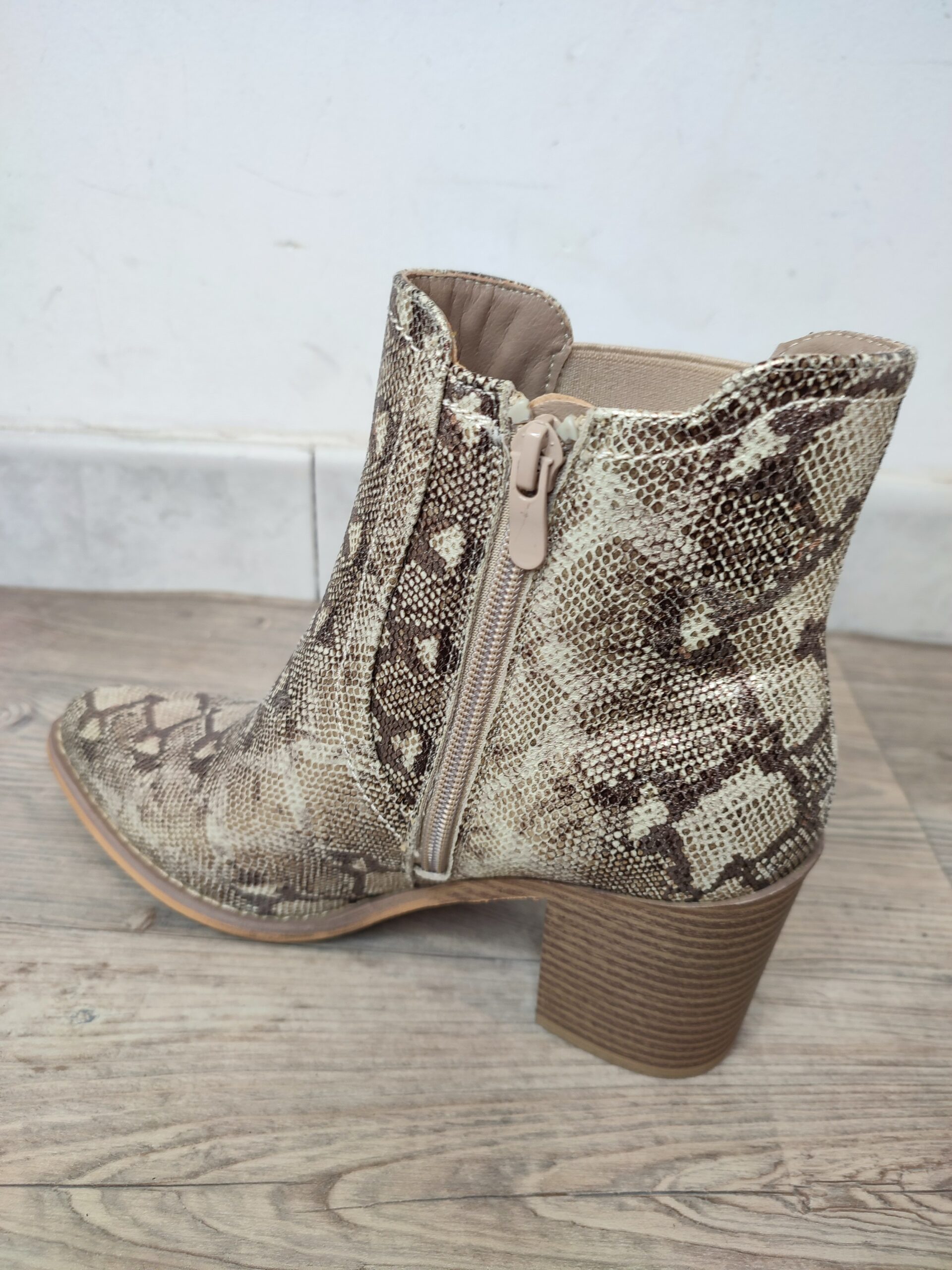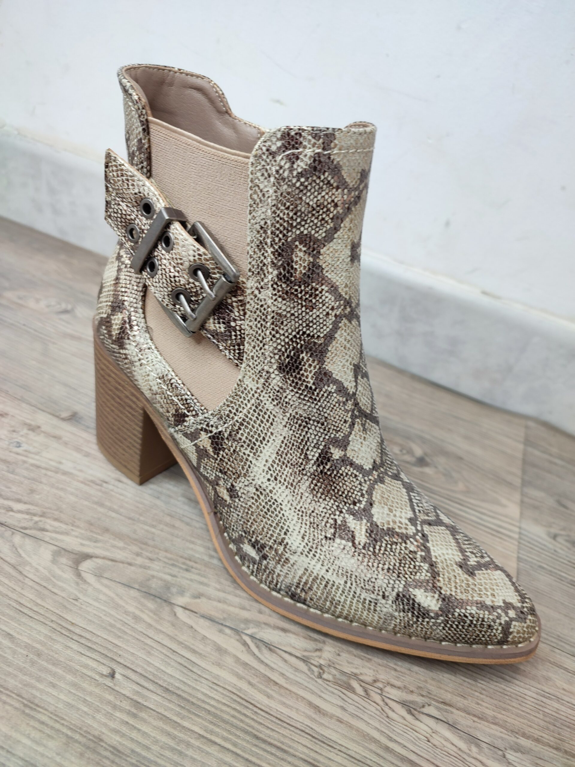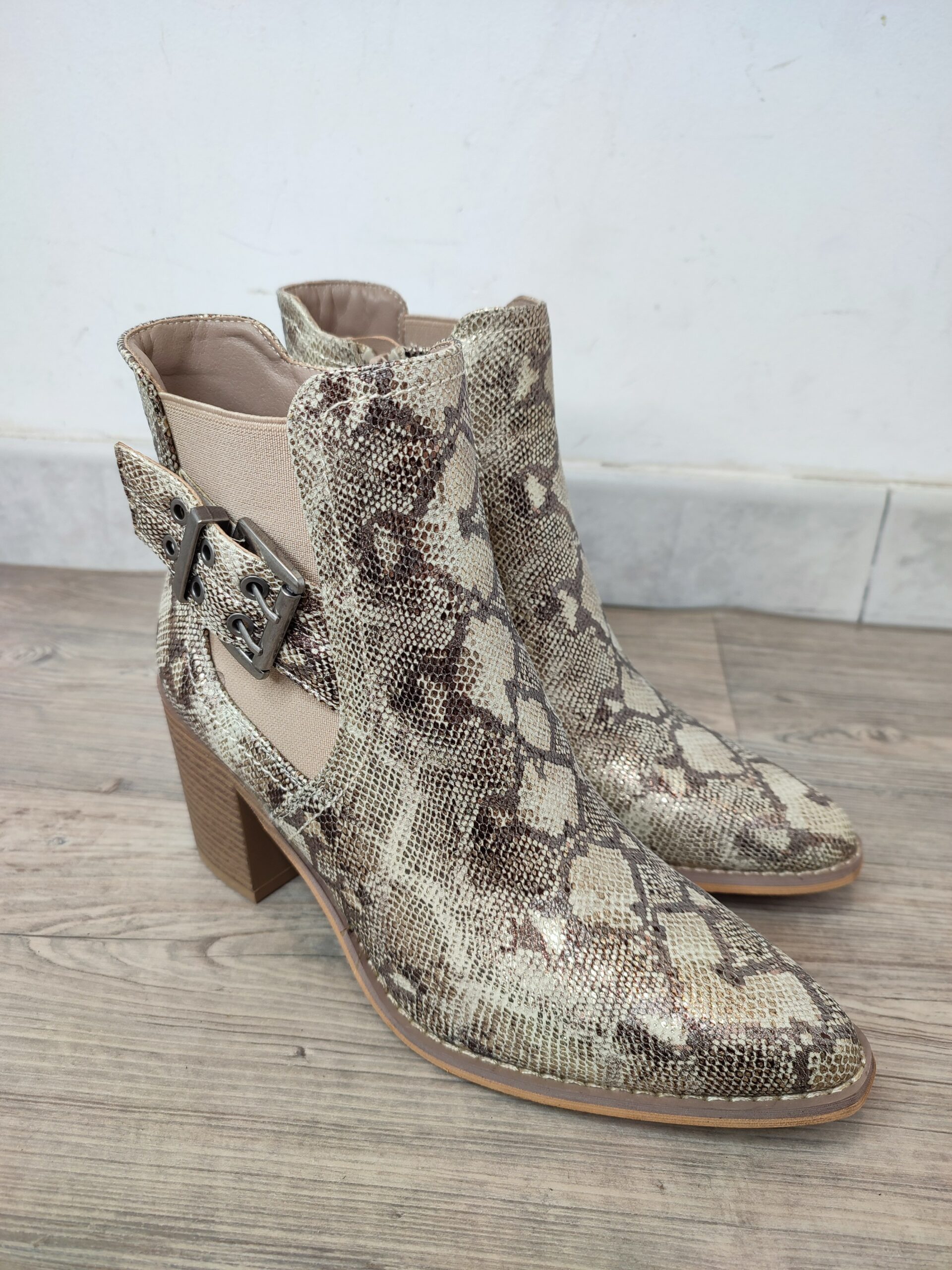 Boots de la marque ERYNN. Fermeture zip sur l’intérieur de la chaussures. Bout en pointe. Effet peau de serpent. Boucle et tissu élastique sur le côté pour gagner en aisance. Talon de 8 cm. Tige de 12 cm. Composition: 100% Synthétique.