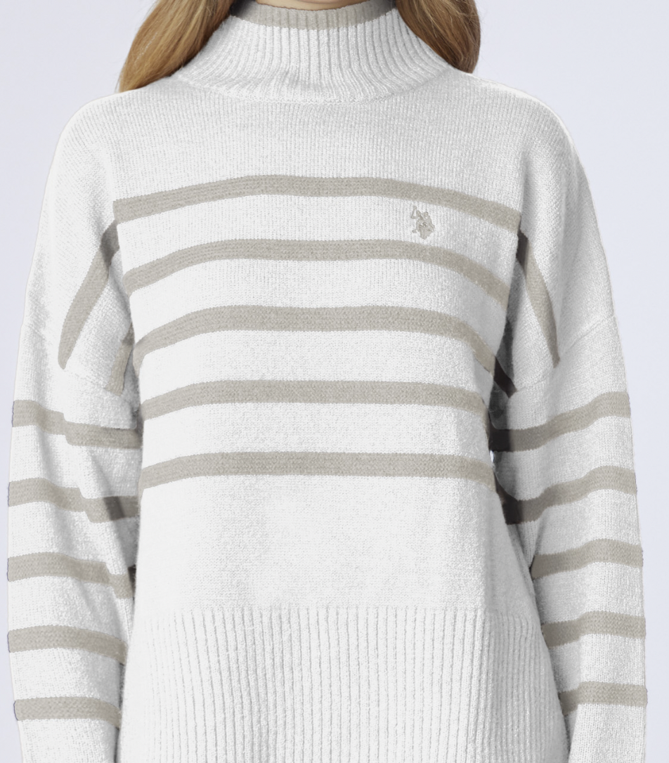 PULL « AGNES » US POLO COL MONTANT BLANC ET BEIGE 45% ACRYLIQUE 29 % POLYESTER 26% POLYAMIDE